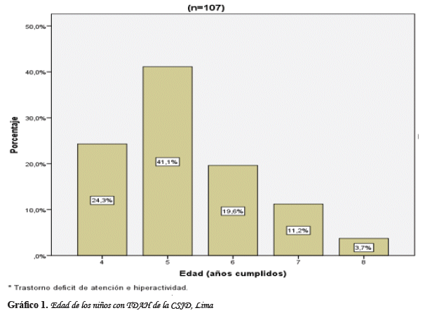 La distribución poblacional fue de 107 niños portadores TDAH de un centro hospitalario de Lima Metropolitana. Entre los datos más resaltantes fueron: la edad 5 años fue 41,1%, sigue 4 años con 24,3%. Gráfico 1.