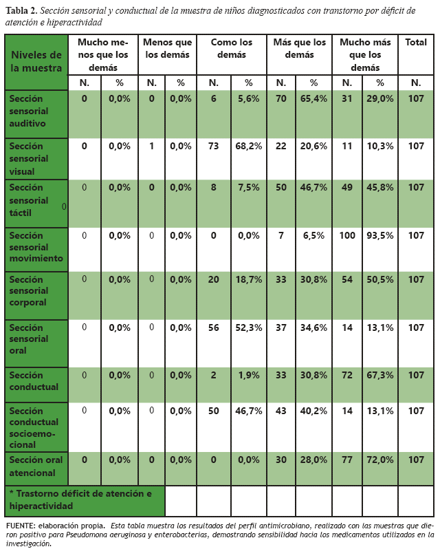 Resultados: De los 107 pacientes con trastorno por déficit de atención e hiperactividad el perfil sensorial buscador se observó los niveles "mucho más que los demás" con 79,4%, el perfil sensorial evitativo "más que los demás" con 41,1 % y "como los demás" con 50,5%. Perfil sensorial sensitivo se observó, "más que los demás" con 49,5%. Así mismo, tenemos el perfil sensorial espectador, se observó los niveles "mucho más que los demás" con un 47,7%.