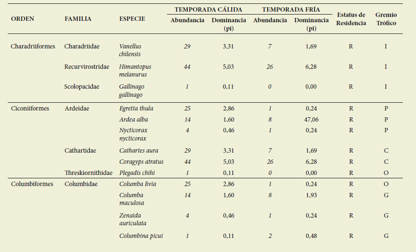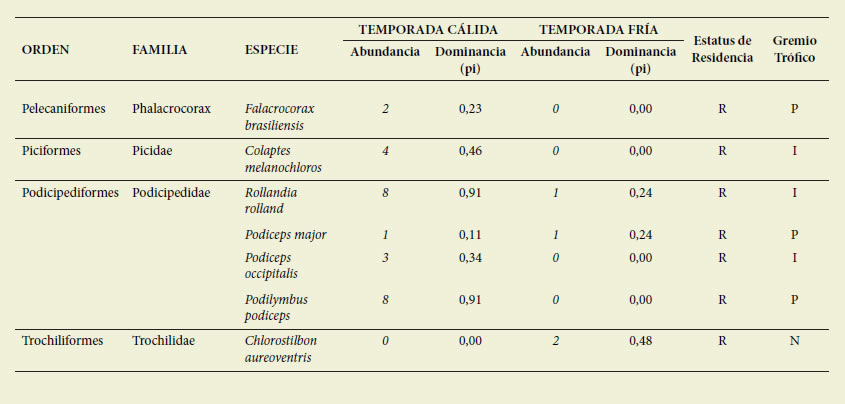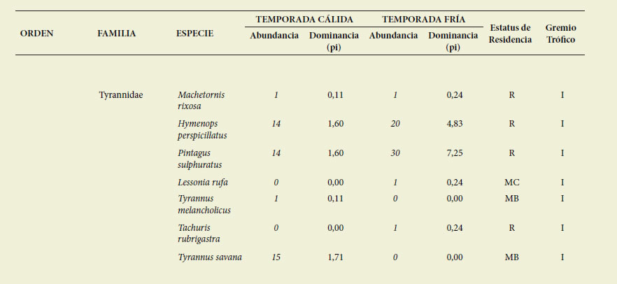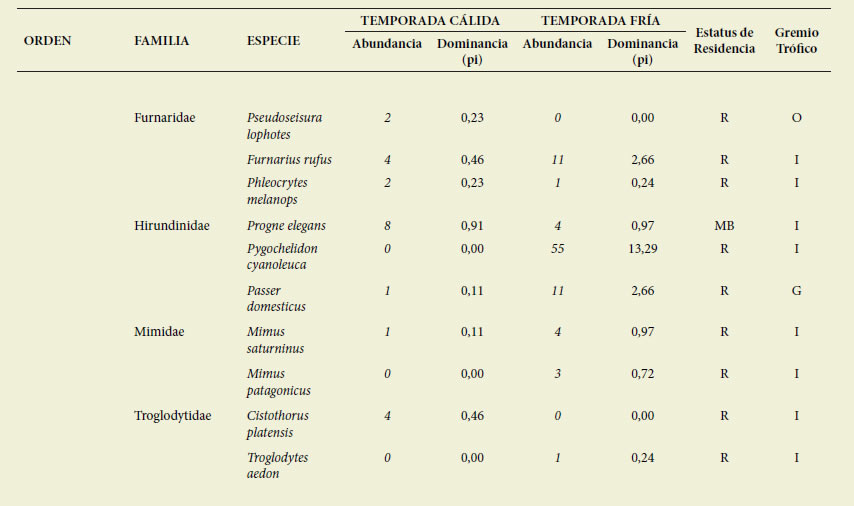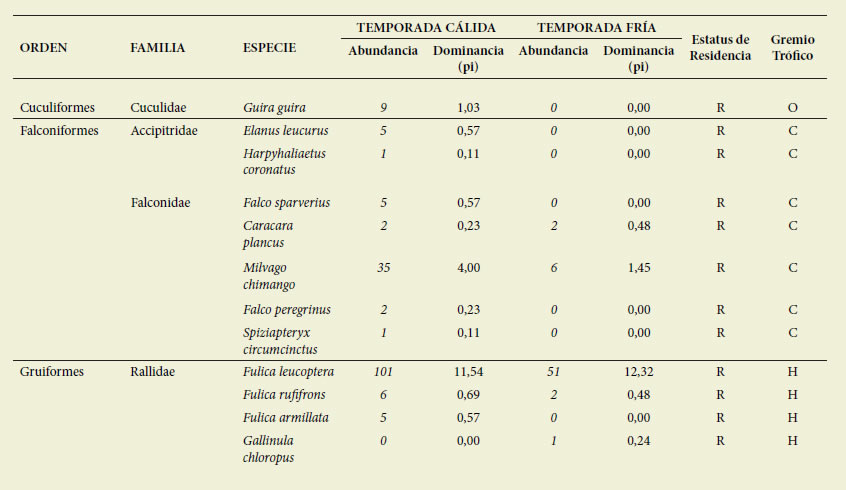 Tabla 1. Lista de especies relevadas. Se indica orden y familia. Para cada temporada (fría y cálida) se indica abundancia y dominancia pi, estatus de residencia y ensamble trófico