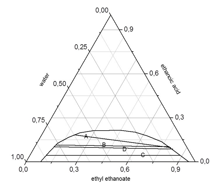 The ternary phase diagram of water/ethanoic acid/ethyl ethanoate system was built using the Origin® software from of equilibrium data obtained in items 2.1 and 2.2. The volumes were converted in mass using the densities of each component at 298.15 K (ρethanoic acid = 1.052 g mL-1; ρethyl ethanoate = 0.901 g mL-1; and ρwater = 0.997 g mL-1). The diagram was used to study the liquid-liquid extraction process of ethanoic acid (C2H4O2) from aqueous phase with the use of ethyl ethanoate as the solvent.