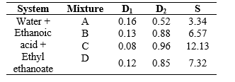 The distribution coefficients (D) and the separation factors (S) for mixtures A, B, C, and D were calculated to evaluate the efficacy of extraction of ethanoic acid by the organic solvent (ethyl ethanoate) by Equation 2. The separation factor, which is a measure of the ability of a solvent to separate a solute from water, was defined as the ratio between the ethanoic acid (D2) and water (D1) distribution coefficients, respectively. The experimental values of the distribution coefficients and separation factors, for each mixture of the ternary system, were listed in Table 7.