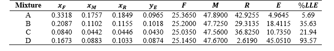 The percentages liquid-liquid extraction (%LLE) of ethanoic acid in water were determined for each mixture by tie-lines method and Equation 3 and can be checked in Table 8. The results suggested that the percentage extraction decreases in the order of the mixtures D > B > C > A, indicating that, for concentrations of ethanoic acid greater than 16% in F, there was a reduction in the solvent extraction capacity. In short, ethyl ethanoate showed good performance in extracting ethanoic acid from the aqueous phase of the mixtures.