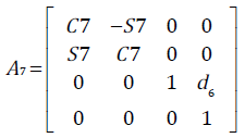 (3)The (4x4) rigid homogeneous transformation matrices A1, A2, A3, A4, A5, A6, A7 shown in the Eqs. (4-10) are computed by applying the D-H parameters listed in Table 1 in the Eq. (3).