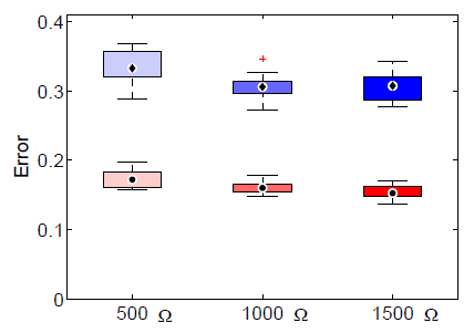 where FP and FN are the false positives and false negatives with respect to the reference VTA, and AA is the reference number of active axons. We chose this evaluation approach because the final aim of our methodology is to estimate a set of parameters that would generate a VTA as close as possible to the target volume. Also, we chose a simplified VTA estimation method for the last part of the validation scheme, instead of the gold standard, because any practical application would require a fast computation of the VTA generated by the estimated parameters (that may differ slightly from the defined target) and the gold standard is too computationally intensive for that purpose. It is important to note that any other fast VTA computation method of similar performance, such as the one in [33], could have been used as part of the validation scheme. Additionally, we carried out tests to evaluate the performance of the machine learning algorithms in the different stages of the proposed methodology, e.g. the precision in the estimation of the stimulation parameters by the SVMs. All experiments were implemented in Matlab R2015a following a nested cross-validation scheme with 10 repetitions, where 70%of the samples were used as a training set and the remaining 30 % as a test set. According to the nested scheme, the free parameters of the algorithms were tuned using 80 % - 20 % 5-fold cross-validation over the training set for each of the main repetitions. Finally, in order to study if there are statistically significant differences in the performance of the proposed method regarding the impedance and conductivity conditions tested, we used the Kruskal-Wallis test over the error distributions obtained from the cross-validation scheme. If the null hypothesis for equal medians is rejected, we performed multiple comparison tests using the Tukey-Kramer scheme [49]. All significance levels were measured at 5%.