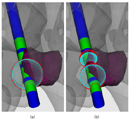 Finally, our group has developed an application that implements the proposed methodology for manipulating the VTA and obtaining the corresponding estimation parameters, together with a 3D visualization system of brain structures and the implanted stimulation electrode reconstructed from magnetic resonance and computed tomography images. Figure 11 shows the brain structures of interest in DBS for Parkinson’s disease, such as the subthalamic nucleus and the thalamus, in addition to the target VTAs and the VTAs obtained from the parameters estimated for one [Figure 11(a)) and two active contacts [Figure 11(b)). This implementation in C++ and Python 2.7, with all machine learning algorithms previously trained, allowed (once the desired VTA was defined) to execute tasks of visualization and deformation of the VTA, and an estimation of the DBS parameters in an mean time of less than 1.5 s in a computer of average specifications (Dell optiplex 990 with an Intel Core i7-2600 processor and 8 GB of RAM). This points to the feasibility of including the proposed methodology in practical applications.