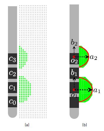, the pulse width in µs, and a vector y = [A, c0, c1, c2, c3], where A is the stimulation amplitude in V, and cr, with r = 0, 1, 2, 3, stands for the activation state and polarity of the r-th electrode contact (-1: cathode, 0: inactive, 1: anode). The electric potential distribution is then used to excite multicompartment axon models arranged in a field in the vicinity of the DBS electrode shaft, as shown in Figure 2(a). Axons that fire an action potential as a response to each stimulation pulse are considered active and their spatial distribution defines the VTA [16]. Thus, a VTA computed from a field of P axons can be coded as a binary vector x ϵ {0; 1} P through axon response concatenation, where xp = 1 if the p-th axon is activated by the stimulation, and xp = 0 otherwise (p ϵ {1, …, P}). Following this representation a dataset of N VTAs and their corresponding combinations of stimulation parameters can be stored as matrices X ϵ