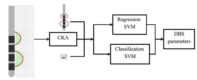 We use an approach based on kernel methods to estimate the configuration of stimulation parameters that generates the VTA closest to the target volume. Figure 4 outlines our approach. It employs Centered Kernel Alignment (CKA) to map the target VTA to a lower dimensional space where the VTA characteristics that better allow predicting the parameters that could have generated the target volume are highlighted. Then, it employs regression and classification Support Vector Machines (SVMs) algorithms to find the stimulation parameters, following the restrictions imposed by the DBS system.