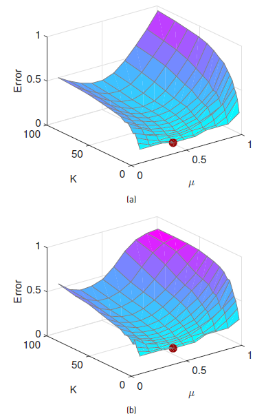 The first stage of the proposed methodology resides in the VTA deformation from a set of ellipses and their associated parameters. In turn, the free parameters of the algorithm, the number of neighbors K and the threshold µ, were tuned through a 10-fold grid search in the ranges K = [1, 99] and µ = [0, 1] aiming for the combination of parameters that generated the smallest error. That is, the smallest error between the deformed VTAs, obtained from the ellipse based characterization of the datasets, and the reference VTAs. Figure 5 shows the average error surface obtained in function of K and µ for the VTA deformation algorithm in the isotropic [Figure 5(a)) and anisotropic [Figure 5(b)) conditions, for an impedance of 1, 000 Ω. For both conductivity conditions it was found that the combination of parameters that generated the smallest error were K = 3 y µ = 0.4. The behavior of these error surfaces with respect to the number of neighbors K indicates smooth variations among VTAs, since small neighborhoods yield the smallest errors (the same behavior was observed for the remaining impedance values).