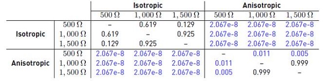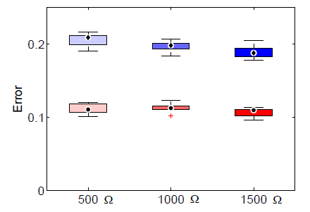 In order to evaluate the proposed methodology in terms of its ability to generate a set of parameters that result in a VTA close to the target one, the error between the VTAs computed from the estimated parameters and the reference VTAs was obtained through equation (12). The estimation of the VTAs from the parameters was made using a hierarchical K-nearest neighbor (HKNN) approach that consists of a data-driven approximation of an expected squared error functional to obtain a local weighted VTA averaging [34]. Figure 10 shows the final reconstruction error for the isotropic and anisotropic cases, respectively. The error distributions, involving information of both monopolar and bipolar configurations, are in ranges of values similar to those reported in the literature for machine learning based VTA estimation strategies that solve only the traditional VTA estimation problem [33, 34]. Also, in congruence with SVM performance a slight downward trend is observed in the median error as the impedance value increases, and higher errors appear when the conductivity of the tissue is assumed to be anisotropic (with respect to the isotropic condition) due to the greater complexity in the form of these activation volumes; however, these errors stayed below those obtained with common techniques for the solution of the direct problem, such as the use of activation functions [33]. Table 1 presents the pairwise statistical comparisons (p-values) of the final reconstruction error distributions, for each impedance and conductivity condition tested. For all impedances there are statistically significant differences in the performance of the proposed methodology between the isotropic and anisotropic conditions. Within the isotropic condition there are not statistically significant differences in the system’s performance as a function of the impedance tested, while for the anisotropic case the system generates errors that are statistically larger for the low-impedance scenario as compared to the medium and high cases.