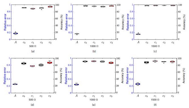 Five independent SVMs were trained, one machine for regression (amplitude) and four machines for classification (contacts state), to estimate the parameters of stimulation that allow generating the target VTA. As evaluation metrics we used the relative error for the regression machine and the classification accuracy for the classification machines, where the relative error was defined as the ratio of the absolute error of the estimated value of A to the true value of A. Figure 7 shows the relative error in the estimation of the stimulation amplitude A, and the estimation accuracy for contacts c0 to c3, discriminated by impedance condition and brain tissue conductivity, isotropic (7(a) to 7(c)) and anisotropic (7(d) to 7(f)). The relative error in the estimation of the amplitude for the isotropic condition oscillates between 0.15 and 0.17. For the state of the electrode contacts the estimation accuracy is higher than 90%. For the anisotropic condition, relative errors of about 0.25 for the amplitude and accuracies of about 90% for the state of each of the electrode contacts are obtained. Except for the low impedance value where the lower bound of the accuracy is about 80%. In comparison with the isotropic condition, these relative errors are higher and the accuracies are evidently lower. For both conditions there is also an upward trend in the mean values of the accuracy as the value of the impedance of the encapsulation tissue increases, with an accompanying reduction in the dispersion of the accuracy data for the estimation of the activation state of each contact.