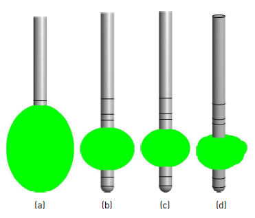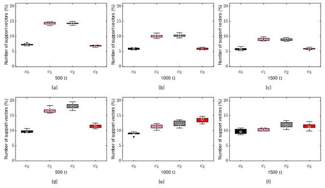 Figures 8(a) to 8(c) show the number of support vectors, expressed as a percentage of the total number of elements of the training set, used by the classification machines trained to estimate the state of each of the contacts, for each impedance condition under study in the isotropic condition. Figures 8(d) to 8(f) show the support vectors used in the anisotropic condition. Overall, the small percentage of support vectors points to the fact that the classifiers are not overfitting the data. Besides, a downward trend is observed in the number of vectors used by the machines in the training as the impedance increases, which indicates that discerning the configuration of each contact for low impedance values was more challenging for the classification SVMs, since the percentage of support vectors tends to increase as the underlying function or decision boundary becomes more complex [42]. This behaviour, and in general the lower performance for low impedance conditions, is due to the fact that the volumes under those conditions tend to cover the spatial regions adjacent to the activated contacts, including areas corresponding to non-active contacts as shown in Figure 9(a), making it difficult to identify the activation state and polarity of each of the four electrodes. In contrast, for high impedance values the extent of tissue activated by the electrical stimulation is reduced, which leads to clearly separated volumes for each contact, as shown in Figures 9(b) and 9(c). On the other hand, the largest errors obtained for the anisotropic tissue condition can be attributed to the fact that in this case the activation volume presents relatively complex morphologies in comparison to the symmetric shapes of the volumes computed for the isotropic assumption, as shown in Figure 9(d).