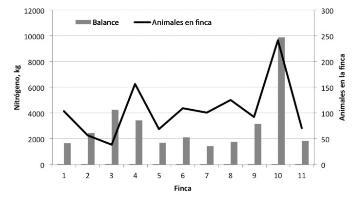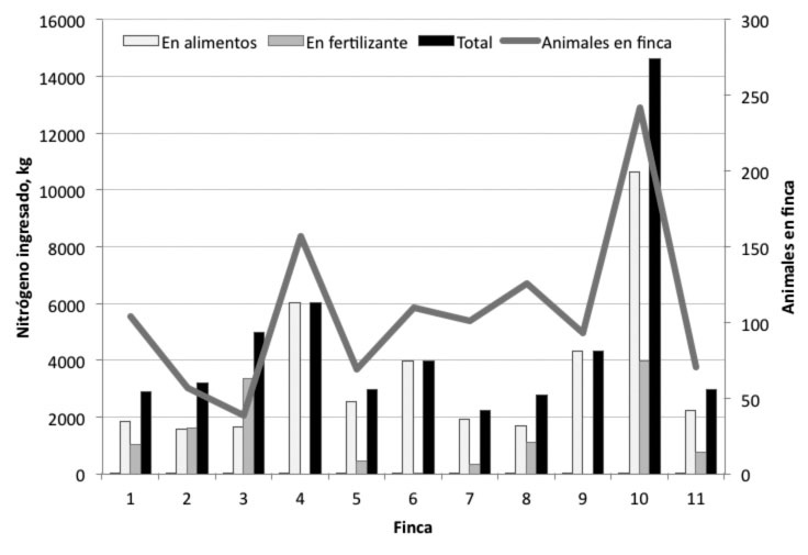 Inicialmente se quiso considerar el tamaño de las fincas, pero se determinó que no todas contaban con información exacta y detallada del área, por lo que no fue posible relacionar el ingreso de N con respecto al área de las fincas. Para eliminar el efecto del tamaño de la finca, las entradas de N fueron expresadas con base en la producción de leche, como gramos de N/kg de leche producida (Spears et al., 2003; Herrero et al., 2006). Así mismo, se calculó la proporción de nutrientes que ingresan por alimentos (incluyendo estos balanceados, subproductos agrícolas, reemplazadores lácteos y pacas de heno), fertilizantes y otros suplementos, con base en el ingreso total. Estos resultados permiten conocer la principal entrada de nutrientes a las fincas.