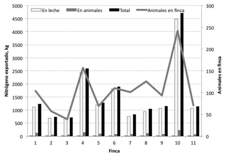 Cuando se consideró la cantidad de N que sale de las fincas, los datos obtenidos muestran que en general las fincas exportaron la mayor proporción de N a través de la venta de leche (Figura 2). En promedio, las once fincas estudiadas exportaron en total 1572 (±1177) kg de nitrógeno, donde un 93% egresó de la finca en la leche vendida y solamente un 7% en la venta de animales. El total de N exportado varió entre 717 y 4716 kg. En un estudio reportado por Hristov et al. (2006) en los Estados Unidos se indica que en ocho fincas analizadas, solamente el 54% del N exportado se hizo a través de la leche, valor muy por debajo al obtenido en nuestro estudio. Sin embargo, es importante recalcar que esta gran diferencia puede deberse a que en dicho estudio, algunas de las explotaciones vendían forrajes, estiércol y otros productos agrícolas producidos en el lugar, situación que no se dio en las fincas de nuestro país. Dichos autores indican también que la proporción de N exportado como animales (vendidos o de desecho) fue de 8%, resultado muy similar al obtenido en el presente estudio.
