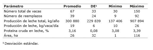 Las fincas analizadas presentaron un amplio rango en las variables evaluadas (Cuadro 1). El número total de animales varió entre 39 y 242. La producción promedio anual de leche para las once fincas fue de 300 880 kg, con un contenido de proteína cruda que estuvo entre 3,08 y 3,39%. El área de las fincas varió entre 1 y 116 ha. Los sistemas de manejo para alimentación de los animales fueron muy diversos, encontrándose pastoreo rotacional, estabulación y semi-estabulación. En cuanto a los ingredientes utilizados para alimentar a los animales, se presentó también una gran variabilidad. La mayoría de las fincas suplían alimentos balanceados, pero también se encontró caña de azúcar, melaza de caña, pulpa de cítricos, pacas de heno, silopacas, maíz molido, destilados de maíz, cascarilla de soya, harina de soya, semolina de arroz, afrecho de arroz, cáscara de piña y cáscara de banano maduro.