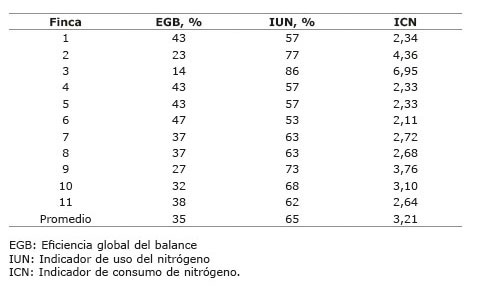 Los resultados de los índices de aprovechamiento de N de las once fincas evaluadas se observan en el Cuadro 2. Estos índices muestran concretamente la eficiencia o ineficiencia de la utilización de los nutrientes.