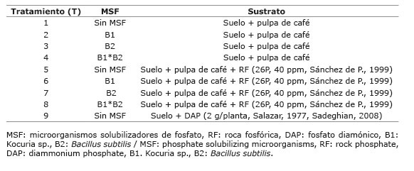 Abstract: Effect of phosphate solubilizing bacteria on the development of coffee seedlings. The aim of this study was to evaluate the effect of solubilizing phosphate bacterias (BSF), Kocuria sp. and Bacillus subtilis , on the development of coffee seedlings Castillo variety. The experiment was conducted in a greenhouse condition, in Palmira, Colombia during 2013-2014 years. The experimental design was completely random, with nine treatments and ten repetitions. The treatments were established under three types of substrates for the seedlings: natural soil ( Typic Melanudand ) + decomposed coffee pulp (1:1) lacking or presenting BSF (treatments 1-4), natural soil + decomposed coffee pulp (1:1) + phosphate rock (RF) with or without microorganisms (treatments 5-8), and natural soil without BSF subjected to fertilization with diammonium phosphate (DAP) (treatment 9). The application of decomposed coffee pulp with and without RF and BSF favored the availability of phosphorus that helped to the development of coffee seedlings, the above was reflected in the chemical analysis of the substrate and the response of variables, root and total dry aerial weight. Length and volume root, foliar P and recovery phosphorus efficiency (ERF), did not present significant differences.