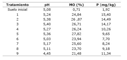 Las características químicas del Typic Melanudand antes del experimento (Cuadro 2), son reconocibles en los Andisoles, ya que presentó un pH ácido (5,08) alto contenido de materia orgánica (MO >20%) y baja disponibilidad de P (Jaramillo, 2009; Bravo et al., 2013; Sánchez y Rubiano, 2015). Después del ensayo en invernadero se observó en promedio, con la aplicación de pulpa de café descompuesta, un incremento en MO, pH y fósforo, en los tratamientos sin roca fosfórica (RF) (1-4) comparados con los que no presentaron el fertilizante mineral (5-8) y con el testigo absoluto, 9 (Cuadro 2).