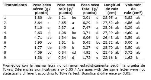 Según el análisis de varianza se observaron diferencias significativas entre tratamientos para las variables de peso seco aéreo, peso de raíz y peso seco total, excepto en longitud y volumen de raíz (Cuadro 3).