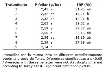 Con relación a la eficiencia de recuperación de fósforo (ERF), el análisis de varianza no mostró diferencias significativas entre tratamientos. Hubo un efecto significativo de la aplicación de pulpa de café en presencia o ausencia de RF, ya que incrementó los contenidos de fósforo foliar con respecto al testigo absoluto (Cuadro 4).