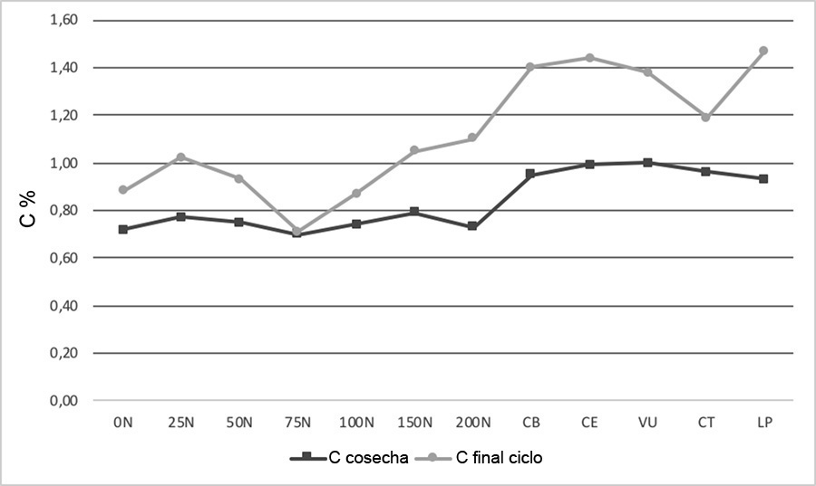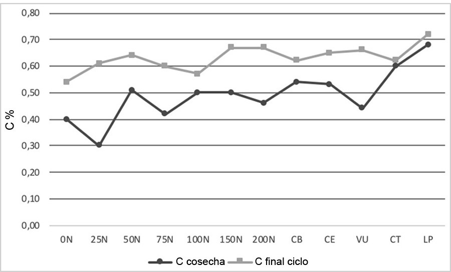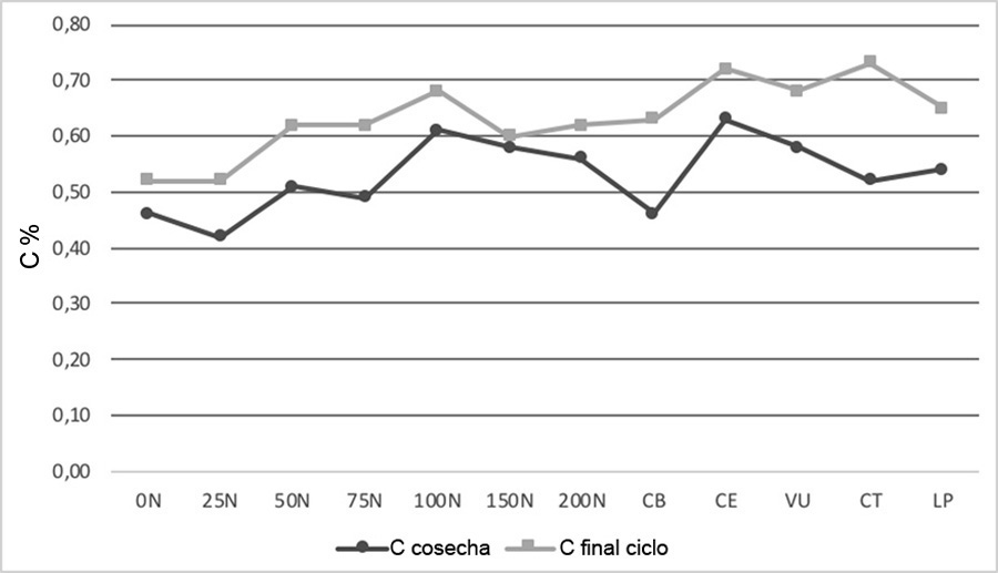 Figure 8. Organic carbon dynamics (C) in the soil (0-20 cm) before the incorporation of the legume and at the end of the corn cycle in Agustin Codazzi, Cesar, Colombia. 2013-2014.