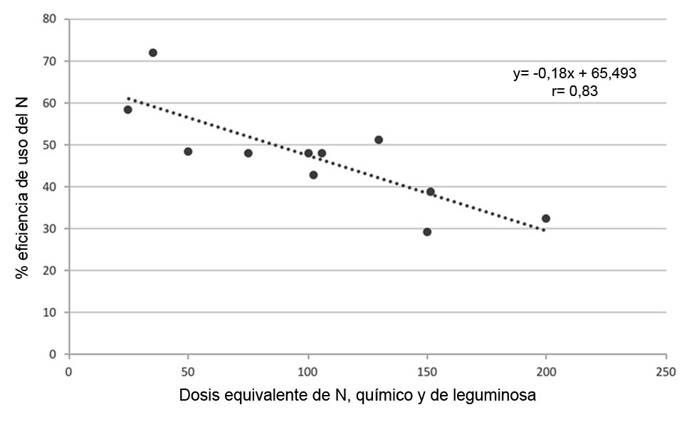 En Nicaragua con C. ensiformis se observaron valores de N equivalente entre 150 - 200 kg/ha (Douxchamps, 2010). En experimentos conducidos en suelos ácidos de los llanos orientales de Colombia se reportó que C. ensiformis, V. unguiculata y Crotalaria espectabilis, tuvieron aportes de N que variaron entre 31 y 326 kg/ha (Navas y Bernal, 1999). Sin embargo, se debe tener en cuenta que en estos estudios el N aportado por las leguminosas incorporadas al suelo se calculó a partir de la biomasa de los materiales y de su contenido de N, y no de N equivalente calculado en función de N químico aplicado.