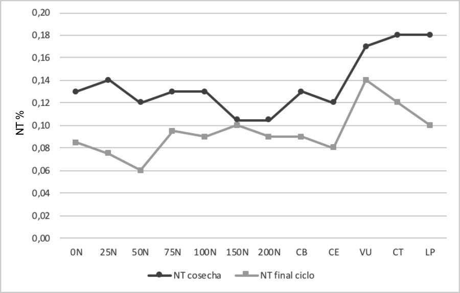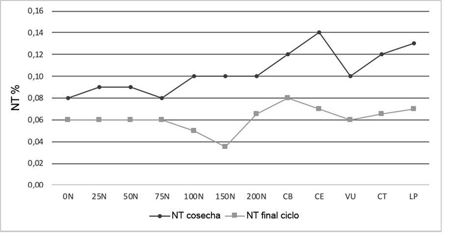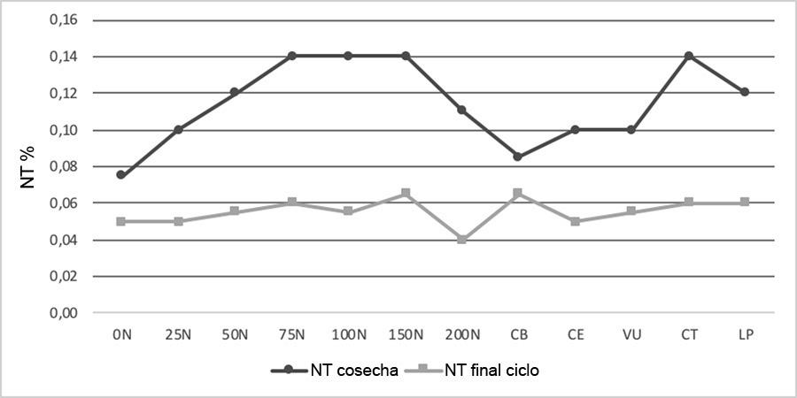 Figure 2. Total nitrogen (NT) dynamics in the soil (0-20 cm) before the incorporation of the legume and at the end of the corn cycle in Agustin Codazzi, Cesar, Colombia. 2013-2014.