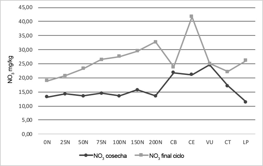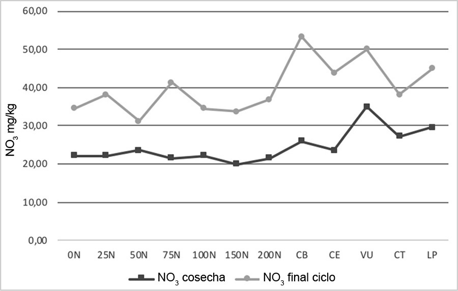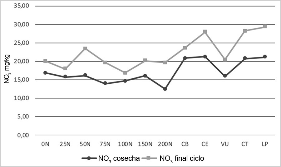 Para interpretar los valores de NO3 observados en el suelo en el presente estudio, hay que tener en cuenta que al fertilizar con N químico se genera un proceso de mineralización en el suelo, mediante el cual parte del N aplicado se volatiliza (15 - 20%) y otra parte se convierte por acción de bacterias (nitrosomas - nitrobacter) en NO2-NO3. El N que la planta no absorbe se pierde por lixiviación o desnitrificación (25 - 30%).
