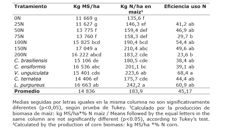 En Agustín Codazzi, con la incorporación de C. brasiliensis, C. ensiformis, C. ternatea y L. purpureus, la producción de forraje de maíz no fue diferente (p<0,05) a la producción que se obtuvo con 200 kg de N/ha; pero con esta última dosis, la producción de forraje de maíz fue superior en un 34% a la que se obtuvo cuando no se aplicó N.