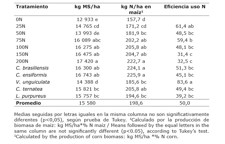 Table 6. Biomass production of indicator crop (maize), N contribution and efficiency of use of N (EFN) in corn in the different treatments in Agustin Codazzi, Cesar, Colombia. 2013-2014.