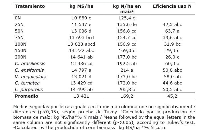 Los resultados de aporte equivalente de N con la biomasa incorporada de las leguminosas evaluadas y su efecto en producción de maíz en este estudio, están en la misma dirección de otros estudios reportados en la literatura. Sin embargo, los resultados no son comparables, pues en esos estudios se midió grano y no biomasa del cultivo indicador (grano en estado lechoso más follaje). Por ej., Fischler y Wortmann (1999) en el este de Uganda, utilizaron Crotalaria ochroleuca, Mucuna pruriens, Dolichos lablab y C. ensiformis como abonos verdes, y observaron rendimientos de grano de maíz y frijol de un 50 a 60% más altos en comparación con rendimientos obtenidos sin abonos verdes. En Kenia, luego de la incorporación de M. pruriens, C. ensiformis y L. purpureus, se aumentó la producción de grano de maíz de 35 a 100% en comparación con la aplicación de fertilizante nitrogenado (Mureithi et al., 2003).