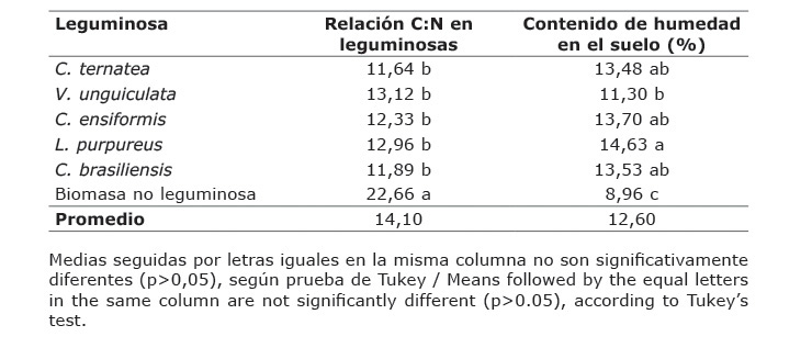 Table 9. Carbon-nitrogen ratio (C: N) and soil moisture in the legumes evaluated in the three study locations, Valle del Cesar, Cesar, Colombia. 2013. 2014.