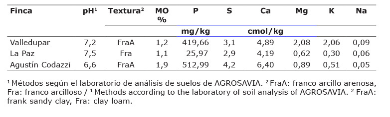 La investigación se realizó en el Centro de Investigación (CI) Motilona de la Corporación Colombiana de Investigación Agropecuaria (AGROSAVIA), ubicado en Agustín Codazzi, y en dos fincas localizadas en los municipios de La Paz (Doña Rosa) y Valledupar (Salguero), microrregión Valle del César, con condiciones de suelo caracterizadas al inicio de los experimentos (Cuadro 1), que reflejaron adecuadas condiciones de fertilidad en términos de pH y disponibilidad de macronutrientes. Se ubicaron tres sitios para replicar los experimentos tanto en el manejo dentro de un centro de investigación, como en fincas en condiciones contrastantes de la zona.