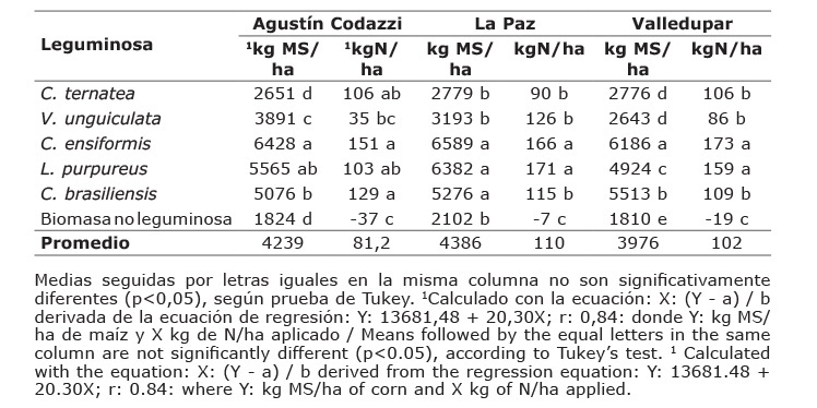 El equivalente de N (kg N/ha) aportado por las leguminosas incorporadas al suelo se cuantificó con una ecuación de regresión (Y =13 681,5 +20,3X; r =0,84), obtenida a partir de la producción de biomasa de maíz (Y) y las dosis de N aplicadas (X). Tanto en el CI Motilonia como en La Paz y Valledupar, el mayor equivalente de N se observó con C. ensiformis (151, 166 y 173 kg N/ha, respectivamente). El menor equivalente en el CI Motilonia y en Valledupar se observó en V. unguiculata (35 y 86 kg N/ha, respectivamente) (Cuadro 3). Mientras en La Paz el menor equivalente se obtuvo con C. ternatea (90 kg N/ha) (Cuadro 2). El valor promedio de equivalentes de N fue mayor en La Paz, asociado a mayores niveles de producción de biomasa de maíz como respuesta a los diferentes niveles de N aplicados y como respuesta en la planta.