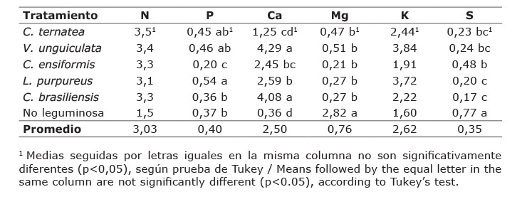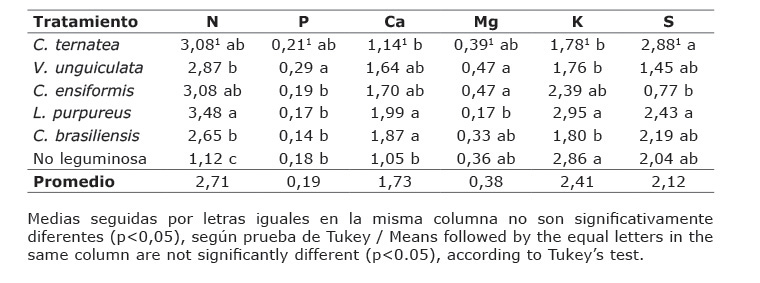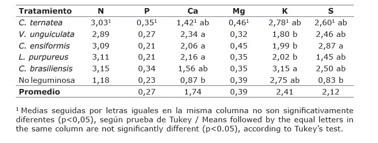 Table 3. Mineral content (%) in the aerial part of the legumes evaluated as green manures in Agustin Codazzi, Cesar, Colombia. 2013-2014.