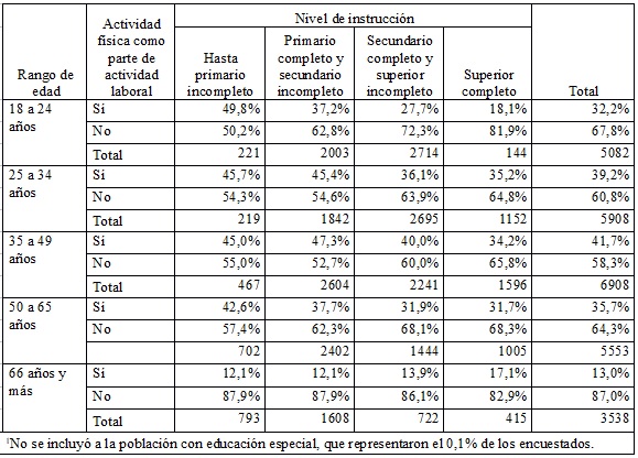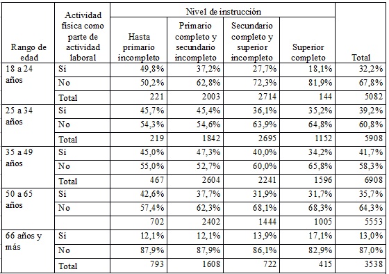 Con la actividad física laboral sucede algo similar, ya que son las personas pertenecientes a los hogares del primer quintil de ingreso (42%) y a hogares con NBI (41%) los que más frecuentemente realizan este tipo de actividad física, mientras que las personas pertenecientes al quinto quintil de ingreso (28%) y a hogares sin NBI (33%) son las que menos lo realizan. Sin embargo, con relación al nivel educativo la relación es menos intensa y no es completamente lineal, ya que son las personas con estudios primarios completos y secundarios incompletos (37%) las que en mayor medida realizan este tipo de actividad, seguidas de las que tienen hasta primario incompleto (34%), mientras las que menos realizan son las que cuentan con estudios superiores (32%).Por otro lado, a diferencia de la actividad doméstica, los hombres (43%) realizan más actividad física laboral que las mujeres (27%). Entendemos que detrás de esta asociación se encuentra el tipo de ocupación que tienen los sujetos. Las actividades de tipo manual son más frecuentes entre los hombres y las personas de menor nivel educativo, a la vez que están peor remuneradas (por eso es más común que haya más miembros de hogares con bajos ingresos y con NBI). La leve asociación con el nivel educativo está vinculada con el hecho de que entre la población con menor nivel educativo tiene más peso la población de mayor edad que en mayor proporción no se encuentra activa en el mercado laboral y por eso no realizan este tipo de actividad. Como puede observarse en la Tabla 3, cuando se controla esa relación por edad, son las personas con menor nivel educativo las que más frecuentemente realizan actividad física laboral y las de mayor nivel educativo las que menos lo realizan, con una diferencia porcentual de 10 puntos o más entre los niveles extremos para todos los grupos etarios (con excepción del grupo de mayor edad, donde la relación se revierte).