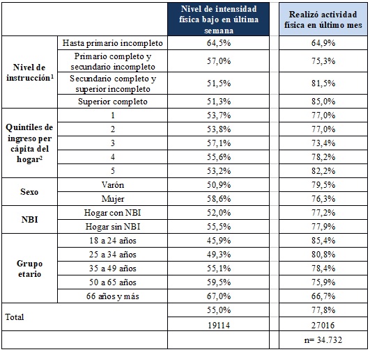 En una de las secciones de la ENFR 2009 se le consulta a la población por la realización de actividad física general durante la última semana. Se utilizó una adaptación del IPAQ (International Physical Activity Questionnaire), que indaga diferenciadamente la cantidad de días y minutos por día que durante la última semana se realizó actividad física intensa, moderada y caminata. Se consideró moderada a las actividades que requerían respirar algo más rápido y realizar algún esfuerzo (por ejemplo tareas domésticas, andar en bicicleta lentamente, natación recreativa, etc) e intensas a las actividades que requerían respirar mucho más rápido y realizar un esfuerzo físico mayor (por ejemplo correr, trabajos manuales como construcción, deportes como fútbol o tenis, etc.) (MSAL, 2011). A partir del tiempo y la intensidad de la actividad física realizada durante la última semana se clasifica a la población según su nivel de actividad física en intenso, moderado y bajo.