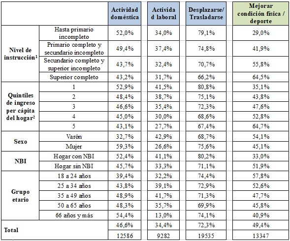 Con relación a la actividad física doméstica, en la Tabla 2 vemos que es más frecuente realizar actividad física por este motivo entre quienes tienen hasta primario incompleto (52%) que entre quienes tienen superior completo (43%), entre los que viven en hogares del primer quintil de ingresos (53%) que entre los del 5to quintil (43%), entre las mujeres (59%) que entre los hombres (33%), y entre los miembros de hogares con NBI (52%) que entre los miembros de hogares sin NBI (46%). Es decir, son los grupos estructuralmente más desfavorecidos los que cuando realizan actividad física, en mayor proporciónlo hacen debido a actividades domésticas.