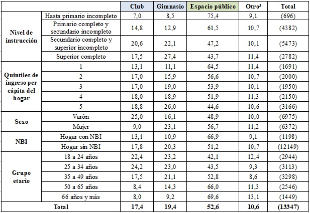 Si bien el patrón observado es a una mayor utilización del espacio público para realizar ejercicio, y en todos los grupos es el principal ámbito para realizar esta práctica, no todos utilizan este espacio en similar proporción. Por el contrario, son los grupos estructuralmente más desfavorecidos quienes en mayor medida, cuando realizan este tipo de actividad física, lo hacen en espacios públicos. Ese lugar es utilizado por el75,4% de quienes tienen hasta primario incompleto, el 64,5% de las personas pertenecientes a hogares de menos ingresos, el 66,9% de quienes viven en hogares con NBI y el 56,7% de las mujeres, frente al 43,7% de quienes tienen estudios superiores completos, el 44,6% de quienes pertenecen a los hogares del quintil de más ingresos, el 51,2% de quienes residen en hogares sin NBI y el 48,9% de los hombres. Cabe destacar que esto no significa que los grupos sociales de menores recursos utilicen más el espacio público para realizar actividad física. Como vimos anteriormente, realizan en mucha menor proporción actividad por deporte o para mejorar la condición física que los grupos de mayores recursos, pero cuando lo hacen utilizan en mayor proporción lugares públicos que privados. A su vez, el espacio público es más frecuente a medida que aumenta la edad (centrándonos en los extremos, 69,6% entre la población 65 años y más frente a 42,1% de quienes tienen 18 a 24 años).