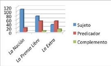 La Nación es el periódico en el que se emplearon la mayor cantidad de titulares no marcados con sujeto como punto de partida, con un total de 108 ejemplos, mientras que en La Prensa Libre se utilizó en 75 casos y en La Extra la cantidad se reduce significativamente, pues solo se registraron 35 títulos estructurados de esa forma.