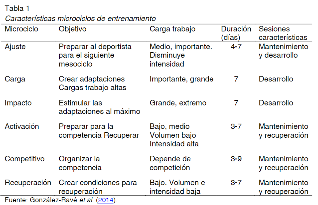 Los microciclos son estructuras más pequeñas, que se prolongan entre cuatro y siete días, y son de gran importancia, pues su estructura y contenido guía la consecución de los objetivos de entrenamiento perseguidos por los atletas (Bompa y Buzzichelli, 2015). En la Tabla 1 se presenta la descripción de las principales características de los diferentes tipos de microciclos que componen los mesociclos de un macrociclo, según el modelo de preparación ATR.
