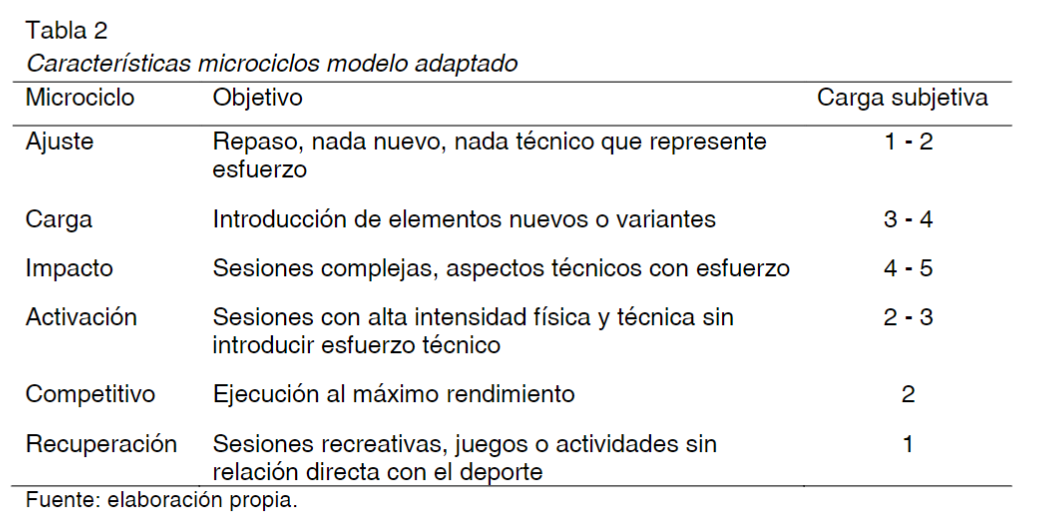 Al completarse un macrociclo (los tres tipos de mesociclos) se dará continuidad al proceso, depurando las destrezas que aún no se han logrado ejecutar satisfactoriamente en situación de competencia o incorporando nuevas destrezas. En la Tabla 2 se presenta la descripción de las principales características de los diferentes tipos de microciclos de la adaptación del modelo ATR al entorno formativo. El objetivo del microciclo se direcciona hacia las características de las actividades técnico-tácticas programadas y la carga de las sesiones corresponde a una valoración de la exigencia de las mismas realizada por la persona responsable de la programación.