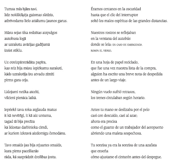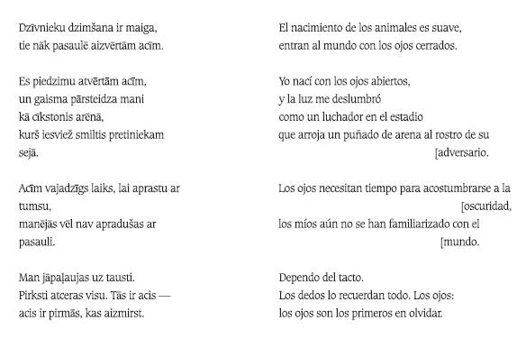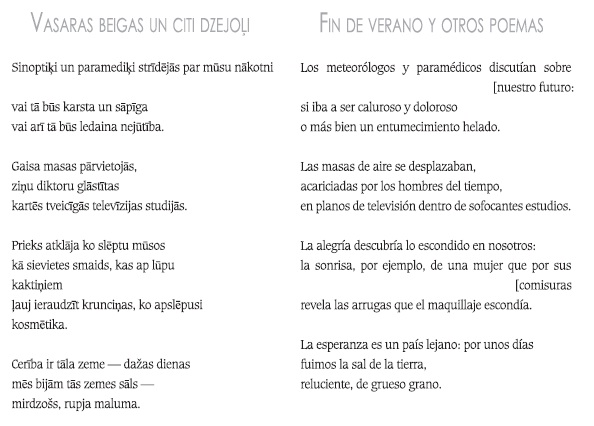 * Arvis Viguls (1987) es un poeta, crítico y traductor letón. Traduce del inglés (Walt Whitman y William Butler Yeats), español (Federico García Lorca), ruso (Joseph Brodsky) y serbo-croata (Vasko Popa). Su primer poemario Istaba (Habitación, 2009), recibió el premio al Mejor Primer Poemario del Sindicato de Escritores de Letonia, y el premio Mejor Poemario del Año del festival Poetry Days. Su segundo poemario, 5:00 (2012), fue aclamado por la crítica y obtuvo un accésit para Mejor Poemario del Año en Letonia. Poemas de Viguls han sido publicados en muchas antologías y revistas literarias en inglés, alemán, ruso, serbo-croata, checo, finlandés, lituano y hebreo. Vive en Riga.