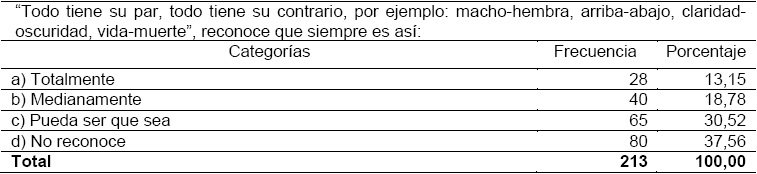 Los datos muestran que los estudiantes no reconocen los ejemplos elementales por los cuales se expresa la contradicción; solo el 13,15% de los estudiantes reconocen con contundencia y firmeza que “todo tiene su par, todo tiene su contrario”, para el caso del estudio es la parte medular de la dialéctica como método; de manera contradictoria el 37,56% de los estudiantes de este nivel no reconocen los ejemplos propuestos acerca de la dialéctica; esto demuestra que la mayoría de los encuestados tienen bajos niveles de conocimiento acerca de la ley de la contradicción.
