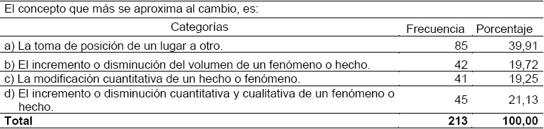 Se muestran los niveles de reconocimiento del concepto de cambio; el 39,91% de la población estudiantil que representan el mayor porcentaje de encuestados optaron por responder considerando al cambio como: la toma de posición de un lugar a otro, esto corresponde a una apreciación sencilla, mecánica y superficial del cambio; por el sentido contrario, un mínimo porcentaje (19,25%) de estudiantes respondieron favorablemente a la proposición del cambio como: modificación cuantitativa de un hecho o fenómeno; sólo el 21,13% de estudiantes, respondieron de una forma acertada y por lo tanto más próximo al concepto de cambio, como “incremento o disminución cuantitativa y cualitativa de un fenómeno o hecho”. La Tabla 2 muestra el bajo nivel conceptual de cambio con que cuenta la población de estudiantes de formación pedagógica; además, los resultados de la tabla expresan el nivel superficial y simplista del concepto de cambio; lo que implica su atención necesaria, puesto que constituye una limitante en la formación profesional.