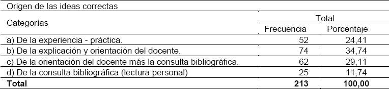 Los resultados de la tabla 4 muestran que en su mayor porcentaje (34,74%) respondieron que las ideas correctas provienen de la explicación y las orientaciones del docente; significa, que la labor del docente formador es decisivo para el estudiante, aquí el docente se convierte en un orientador pedagógico; un menor porcentaje (11,74%) de estudiantes respondieron, de la consulta bibliográfica, es decir, de las lecturas personales; en cambio, un porcentaje aceptable (24,41%) de los encuestados respondieron, que las ideas correctas surgen de la práctica; este porcentaje de respuesta es importante, porque a lo menos de los 213 estudiantes encuestados que hacen el 100%, exactamente 52 estudiantes reconocieron la importancia de la práctica como la fuente y base de la ideas correctas.