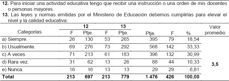 Luego de los tratamientos estadísticos los resultados muestran un valor de la puntuación promedio de 3,5, valor que se ubica entre a veces y con un ligero acercamiento a usualmente; significa, que las disposiciones interpuestas por otras personas deben ser cumplidas, del mismo modo que para iniciar una actividad educativa le es necesario recibir instrucciones; de lo contrario se ven limitados para emprender actividades; de ahí que en su mayoría usualmente están empeñados a cumplir las actividades pedagógicas tal como las normas educativas las promueven, así sea para elevar el nivel de la calidad de la formación profesional u otras actividades similares.
