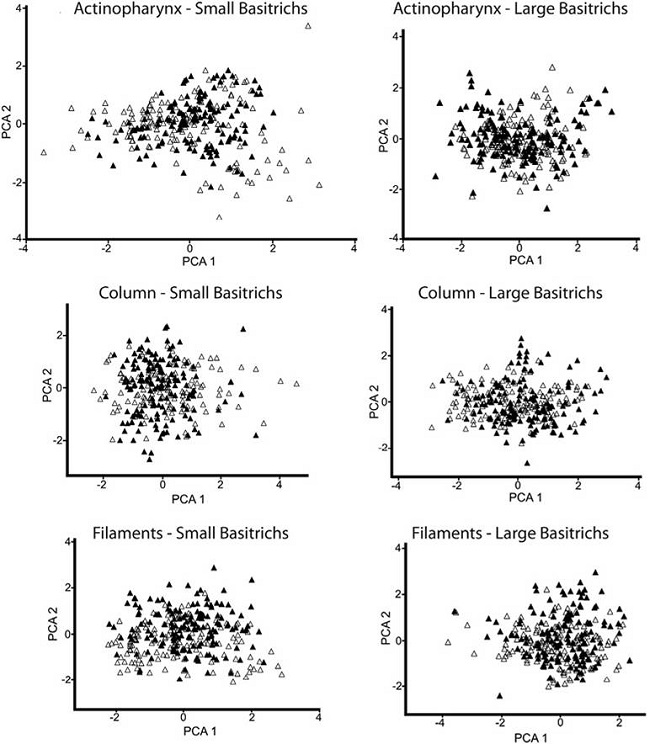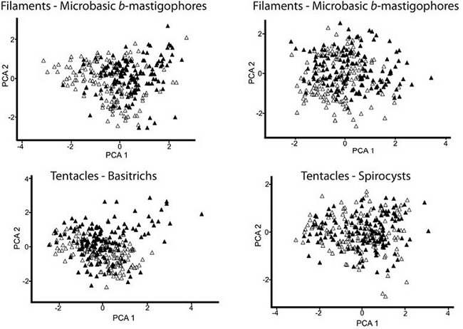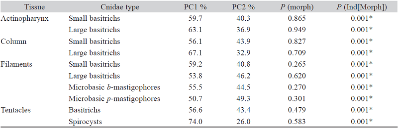 The PCA ordination of samples from all tissue types showed that the first principal component explained a higher percentage of variability in all cases (Table 1). The first principal component represents the cnidae length, while the second principal component is related with the cnidae width (Figure 2 and Figure 3). Overall, no significant variation in cnidae size between the green and pink/purple morphotypes was found in any of the comparisons made (Table 1). However, significant variations in cnidae size were found within each morphotype, in all cases.