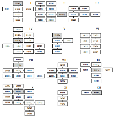 f. Revelación de la tipología. Las nubes conformadas se denominan mediante una nomenclatura única que exprese la frecuencia con la que se repite el valor de cada indicador, en el conjunto de índices clasificatorios que agrupa la nube estudiada. Tales variaciones se expresan de las cuatro formas ejemplificadas a continuación (Ibid.).