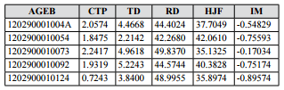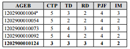 Sucesivamente, se elaboró una nueva matriz, en ella se remplazaron los montos de los cinco indicadores por combinaciones de índices clasificatorios que corresponden a cada AGEB, según el rango asignado a su valor (Cuadro 3).