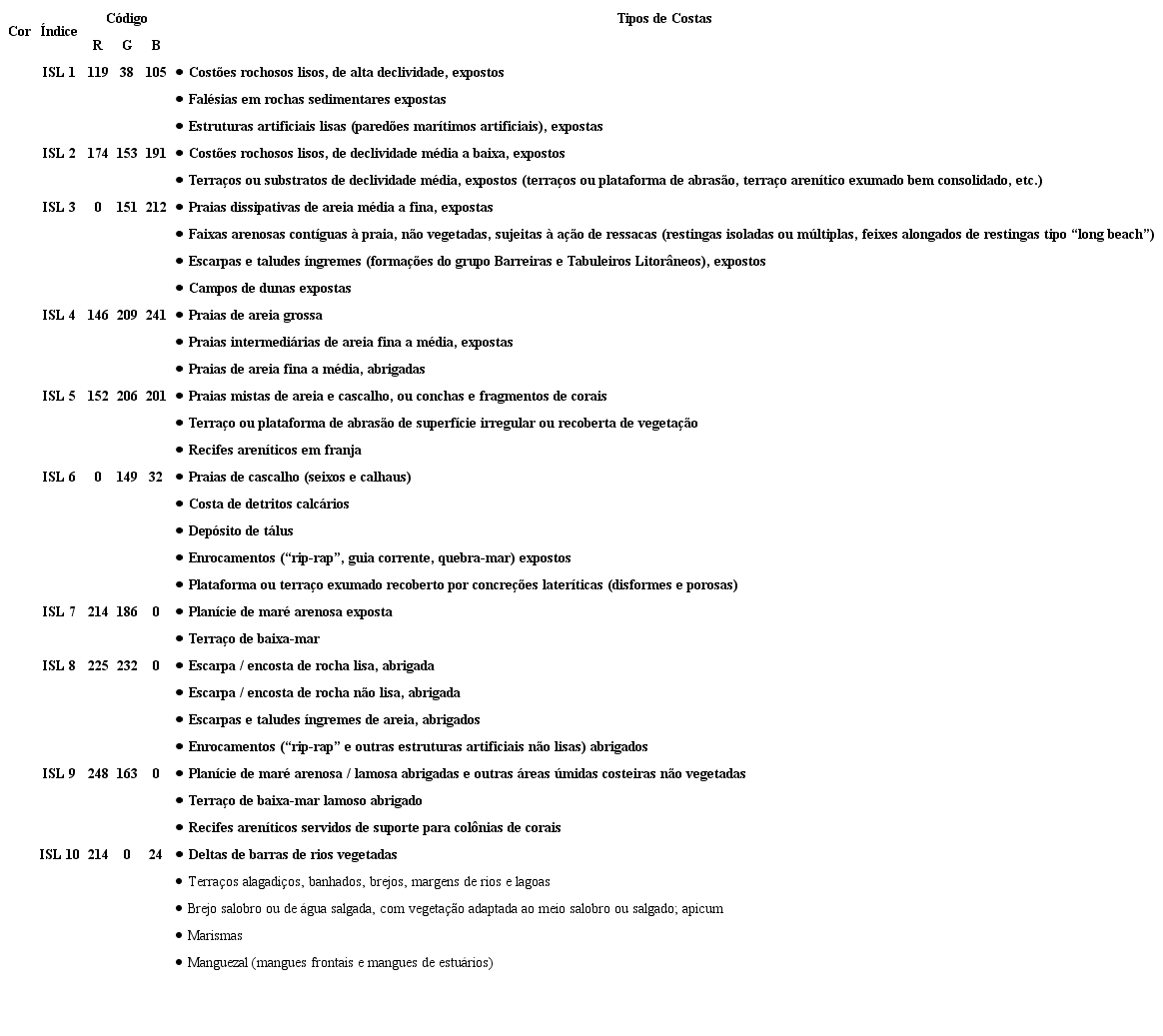 A partir disso foram estabelecidos os seguintes índices de sensibilidade do litoral a derramamento de óleo: ISL 1, atribuído aos costões rochosos expostos de alta declividade; ISL 2, que corresponde as áreas rochosas expostas de média a baixa declividade; ISL 4, que compreende as praias abrigadas de areia fina a média; (4) ISL 5, para praias mistas de areia e cascalhos; (5) ISL 6, para os depósitos de tálus e enrocamentos; (6) ISL 10, caracterizados por terraços alagadiços, brejos e manguezais (Figuras 2e3). O ISL 1 e 2, em ambos os casos, aplica-se a áreas de costões rochosos com características semelhantes. A grande diferença entre esses índices refere-se basicamente a declividade apresentada pelas superfícies rochosas: consideradas como de ISL 1, quando exibem mais de 30° de inclinação; e de ISL 2, para declividades inferiores a 30° (Tabela 1; MMA, 2002). Em superfícies rochosas, de ambos os casos, normalmente não ocorre penetração de óleo, que tende a permanecer por pouco tempo no ambiente.